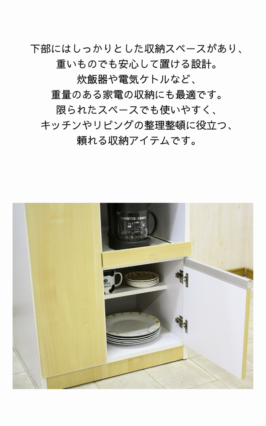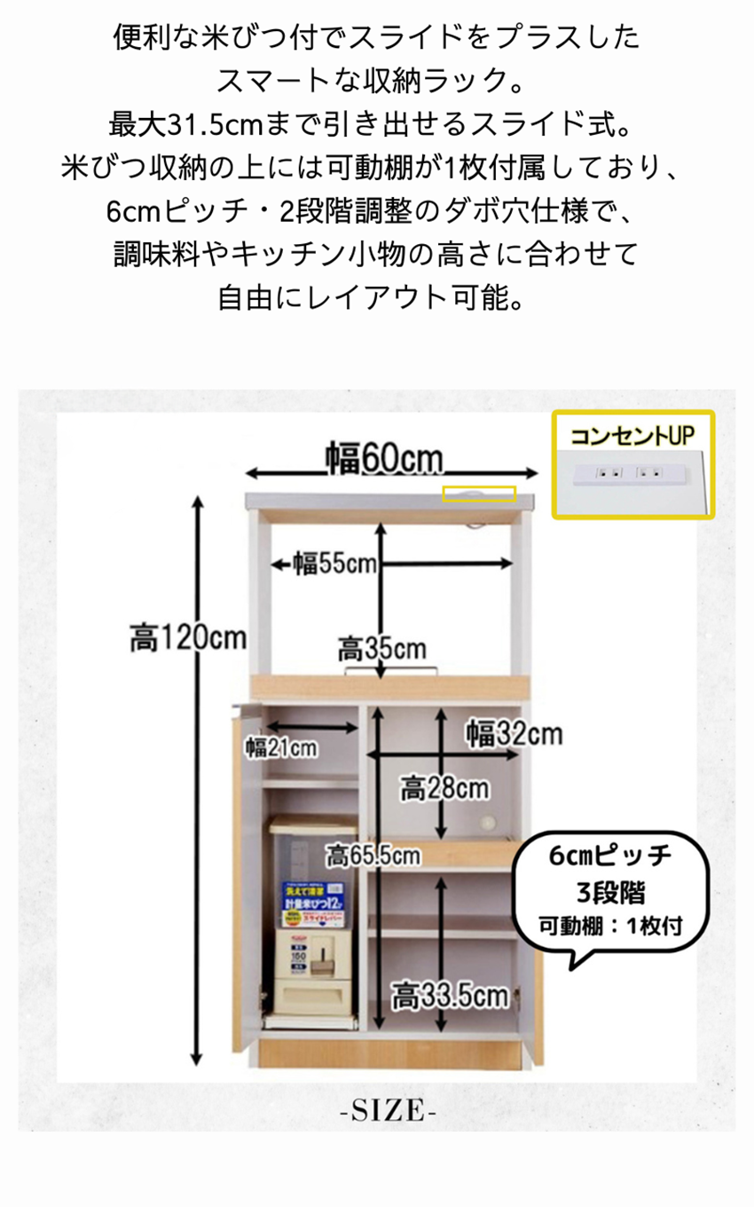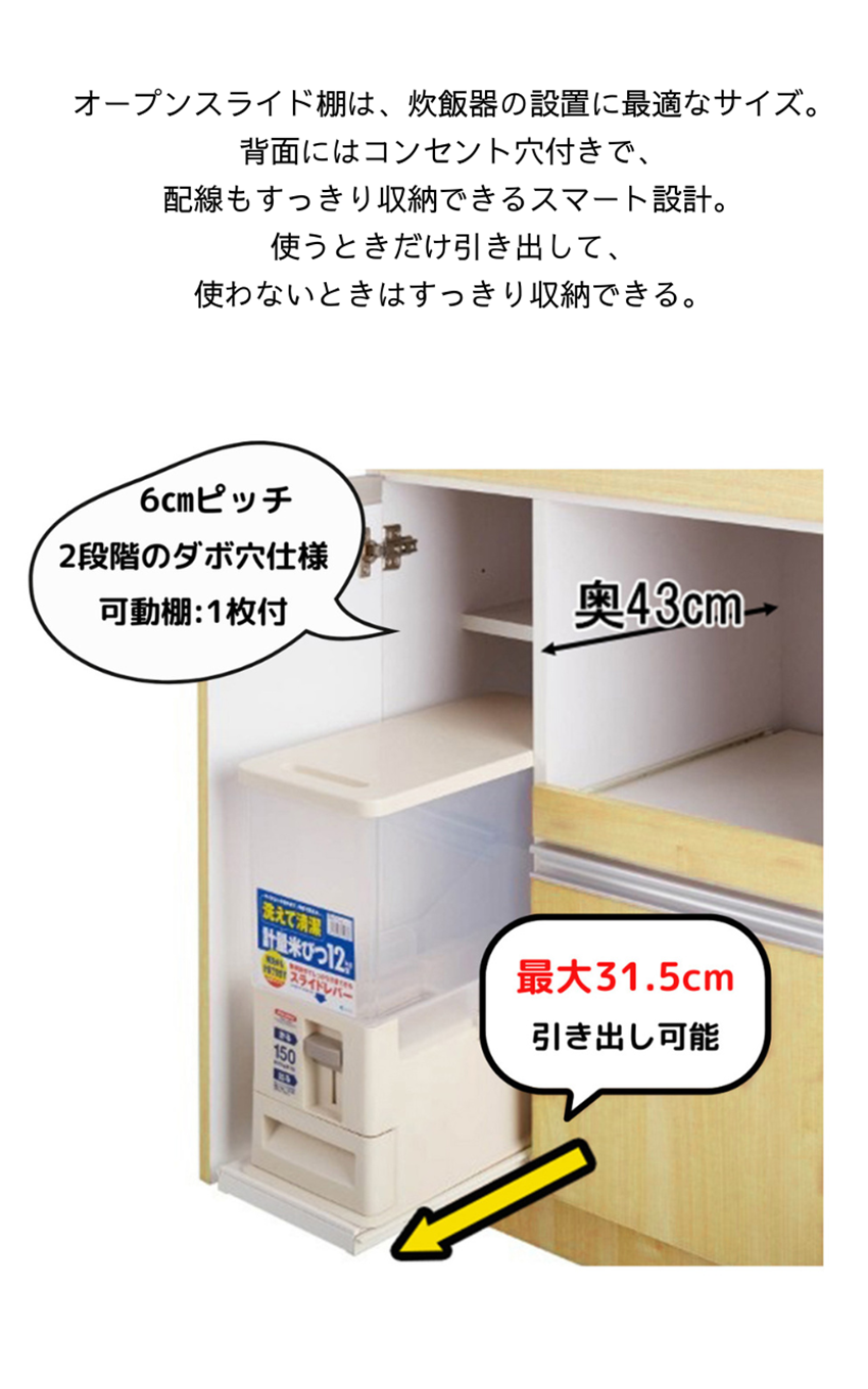 | サイズ | 本体サイズ:幅60×奥行45×高さ120cm オープン部サイズ:幅55×奥行42×高さ35cm 米びつサイズ:幅19×奥行42×高さ41cm 3辺合計:229cm 運送会社:大型家具配送便 リードタイム:7日~10日間 |