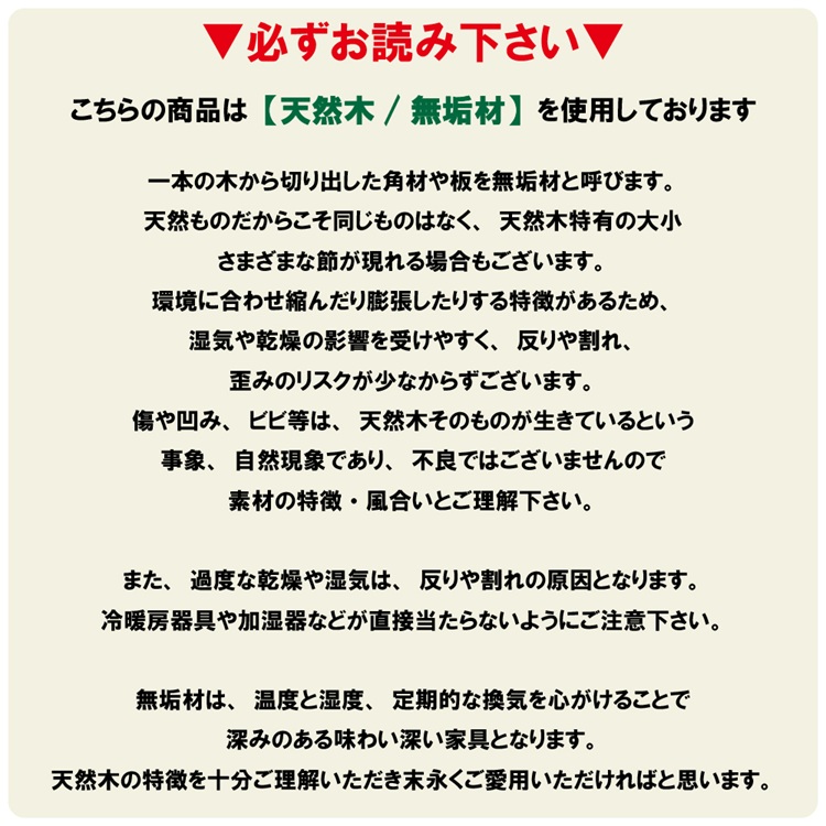 | 注意事項 | アンティーク仕上げとなっており、若干天板反りなどがある場合がございます。 天然木につき、節・流れ節などがございます。節・流れ節での返品・交換は不可とさせていただきます。 |