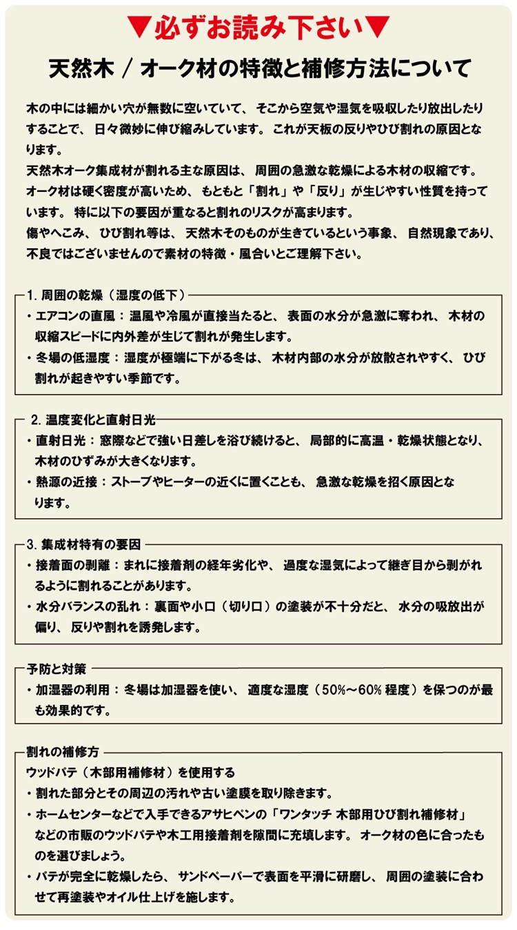 | 素材 | 天板:オーク材(ナラ材)横ハギ 脚:ラバーウッド 塗装:ウレタン塗装 |