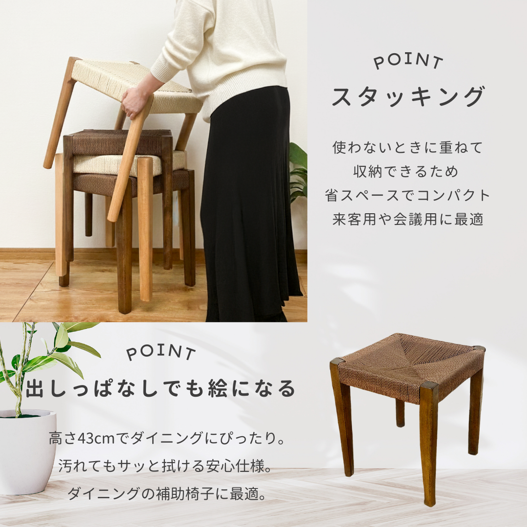 ●木部はビーチ天然木、座面はペーパーコード仕様の北欧風スタッキングスツール。