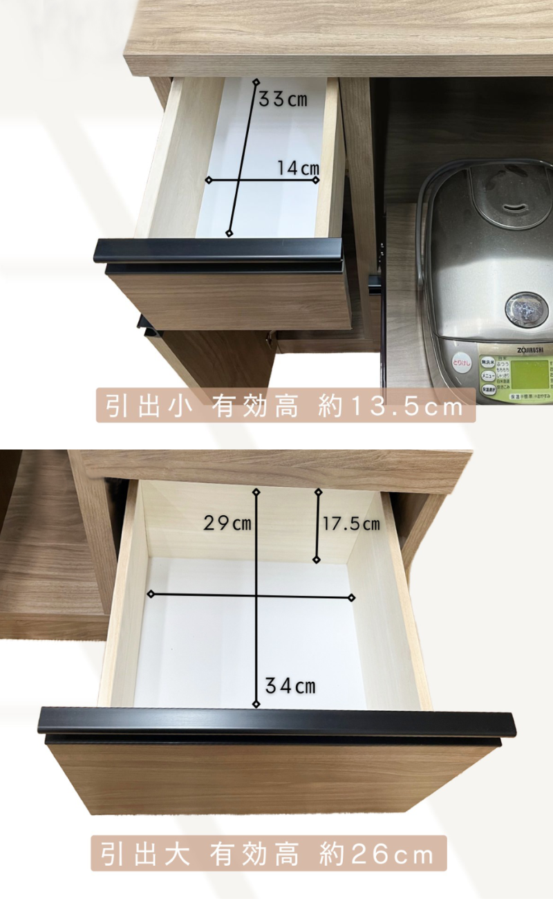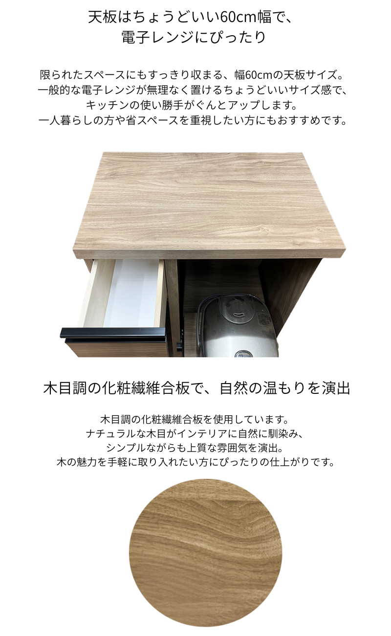 | 素材 | 天板:強化紙プリント化粧繊維合板 前面:強化紙プリント化粧繊維合板 引手:樹脂 |