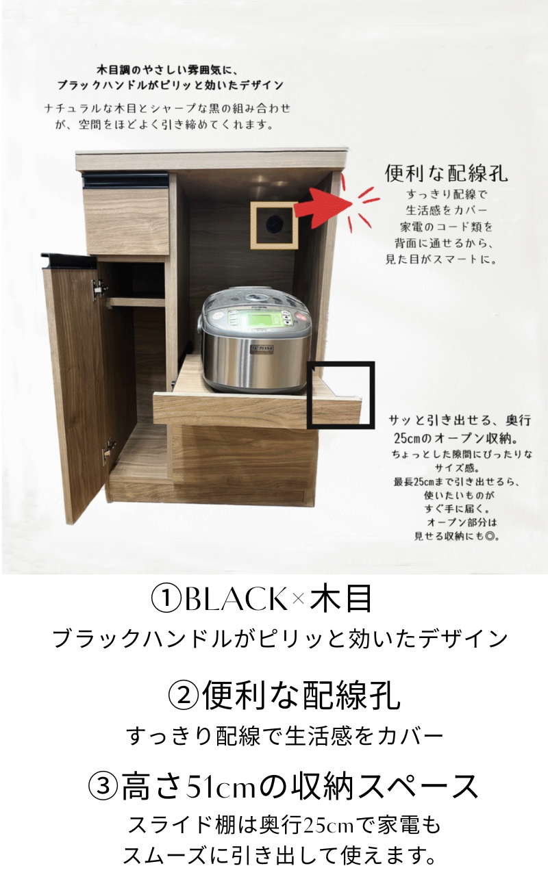 シャープなブラックのハンドルが高級感を演出し、前面には木目調の化粧繊維合板を使用。洗練されたデザインが、インテリアにも自然に馴染むアイテムです。
