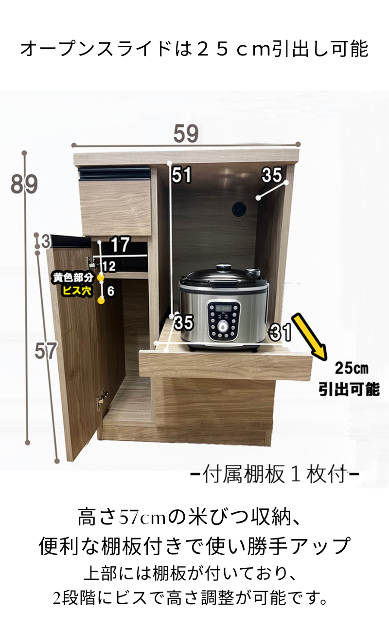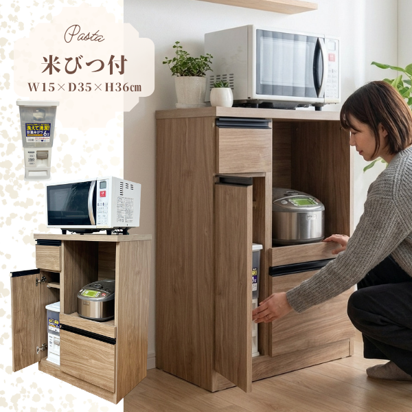 幅60cmの省スペース設計で自然にに馴染むキッチン収納アイテム。米びつ付。