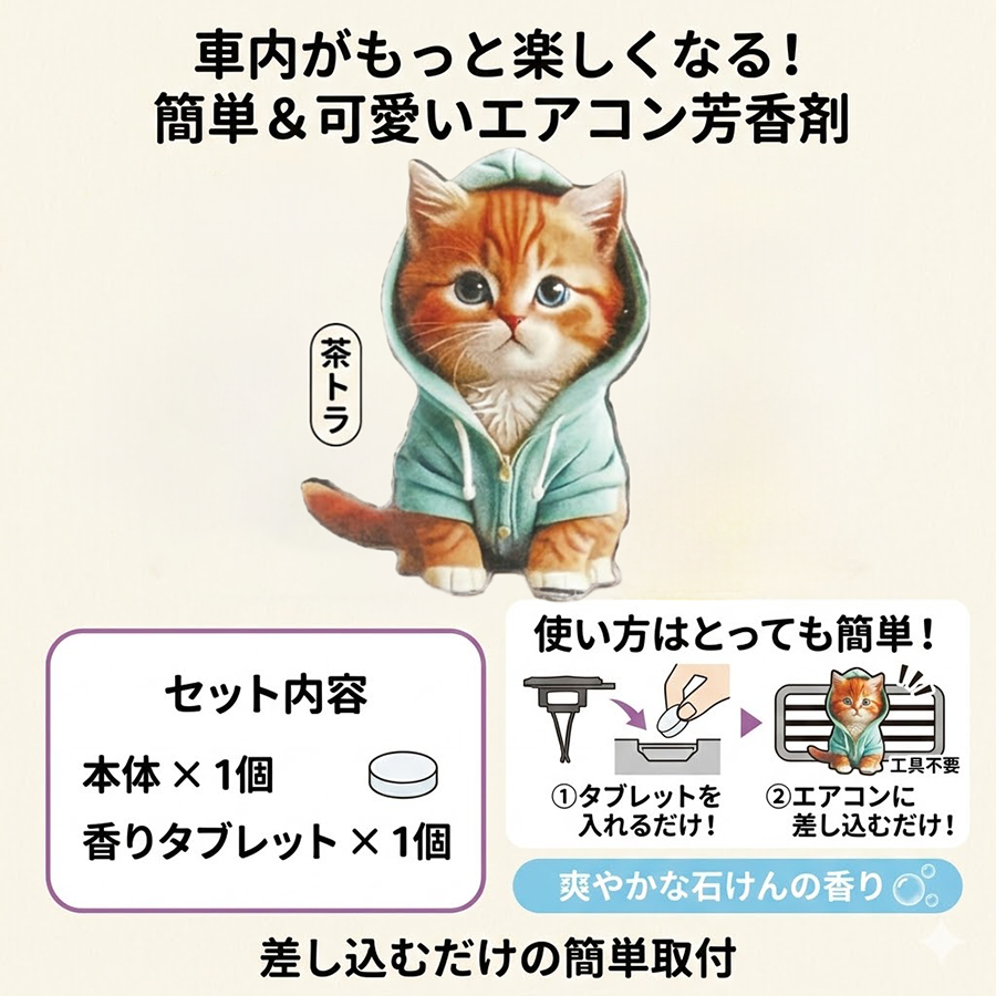 ・エアコンの吹き出し口を可愛く&車内がいい香り(爽やかな石鹸の香り) ・車載エアコン送風口取付タイプ ・ 差し込むだけの簡単取付