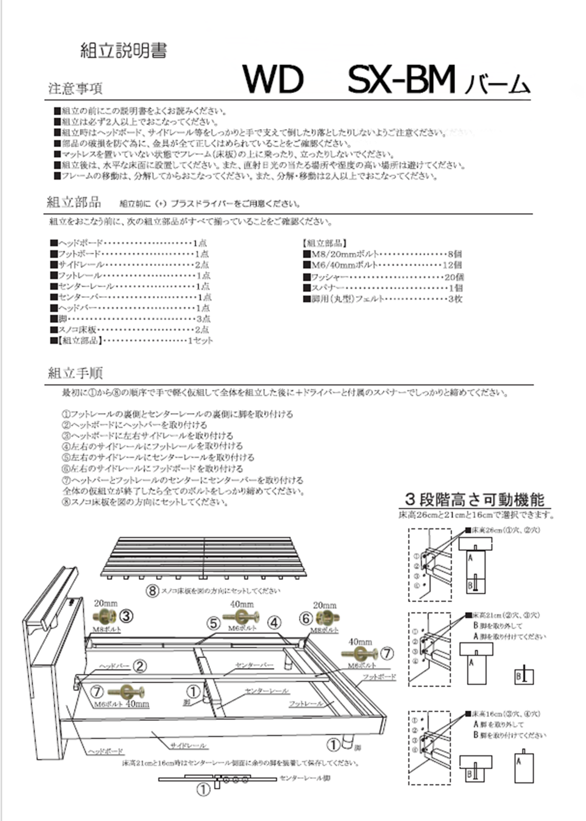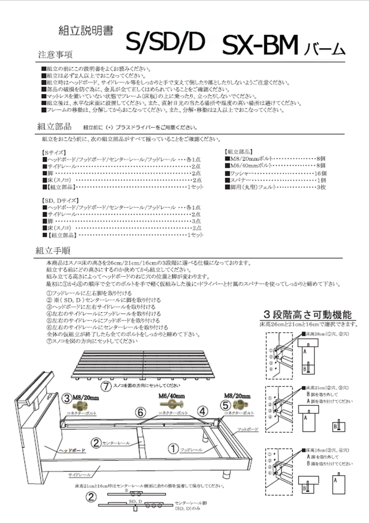 注意事項 | ・高さを変える際は、しっかり固定できているかを必ずチェックをお願いします。がたつきの原因になります。 -----必ずお読みください----- ※取り寄せの為発注後のキャンセルはできかねます ※ベッドフレームのみの販売になります。 |
