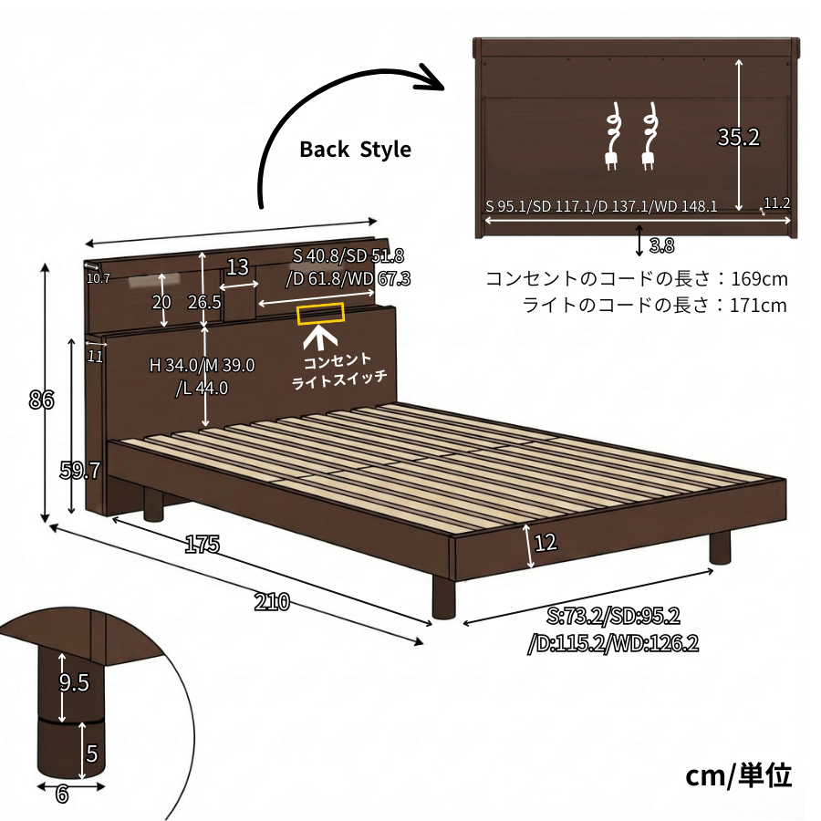 | サイズ | 【製品SIZE】 ■Sサイズ W99×L211×H86.2 SH258/208/158 ■SDサイズ W121×L211×H86.2 SH258/208/158 ■Dサイズ W141×L211×H86.2 SH258/208/158 ■WDサイズ W152×L211×H86.2 SH258/208/158 【適用マットレスSIZE】 ■Sサイズ W97×L200×H15~20 ■SDサイズ W120×L200×H15~20 ■Dサイズ W140×L200×H15~20 ■WDサイズ W150×L200×H15~20 |