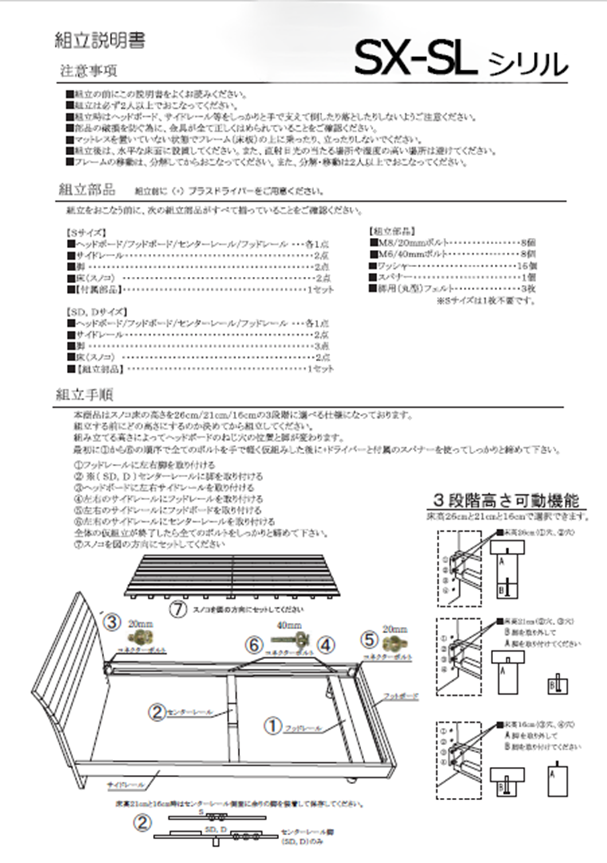 サイズ | 運送会社:大型家具配送便 リードタイム:7~10日 【製品SIZE】 ■Sサイズ W99×L206.6×H85 SH258/208/158 ㎝ ■SDサイズ W121×L206.6×H85 SH258/208/158 ㎝ ■Dサイズ W141×L206.6×H85 SH258/208/158 ㎝ 【適用マットレスSIZE】 ■Sサイズ W97×L200×H15~25 ■SDサイズ W120×L200×H15~25 ■Dサイズ W140×L200×H15~25 |