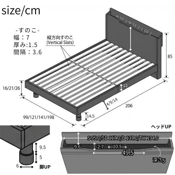 | サイズ | 運送会社:大型家具配送便 リードタイム:7~10日 【製品SIZE】 ■Sサイズ W99×L205.7×H85 SH258/208/158 ㎝ ■SDサイズ W121×L205.7×H85 SH258/208/158 ㎝ ■Dサイズ W141×L205.7×H85 SH258/208/158 ㎝ ■ツインサイズ W198×L205.7×H85 SH258/208/158 ㎝ (※ツインサイズ 上記寸法は、右側・左側の2台を並べた際の合計サイズです。) 【適用マットレスSIZE】 ■Sサイズ W97×L200×H15~25 ■SDサイズ W120×L200×H15~25 ■Dサイズ W140×L200×H15~25 ■ツインサイズ Sサイズ(シングル)マットレスを2枚並べて構成される寸法です。 |
