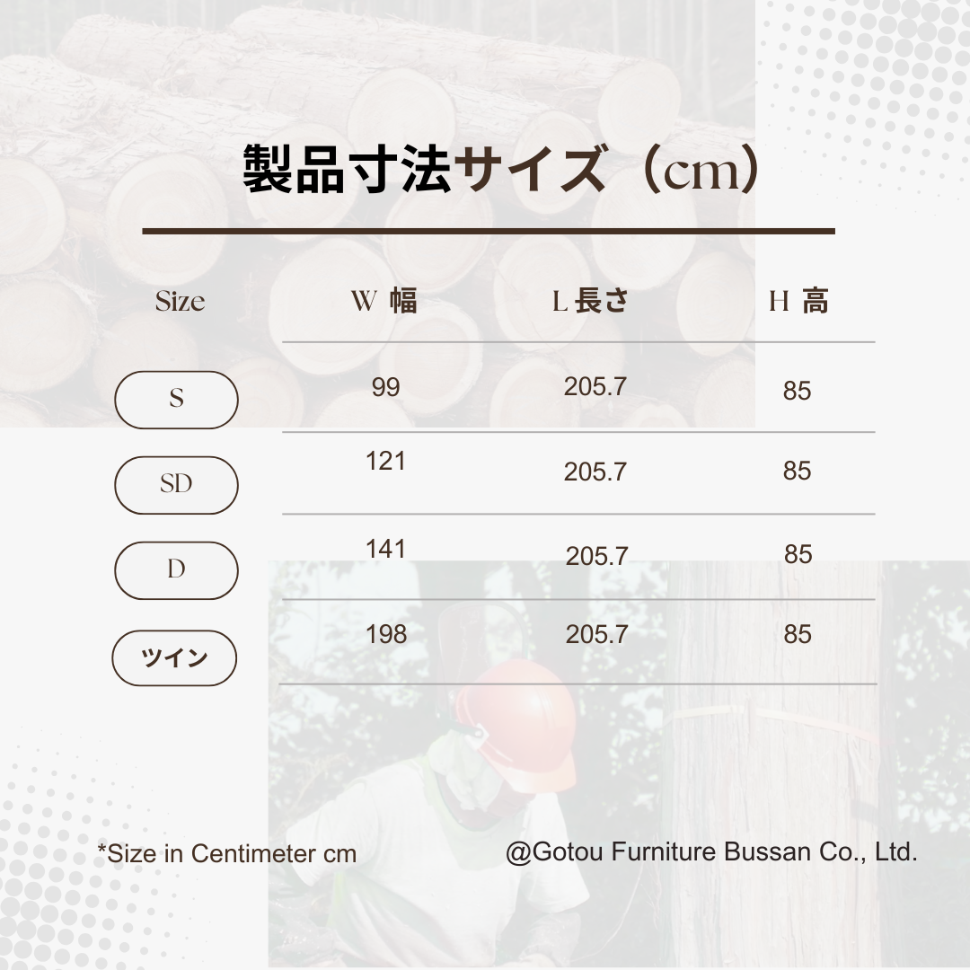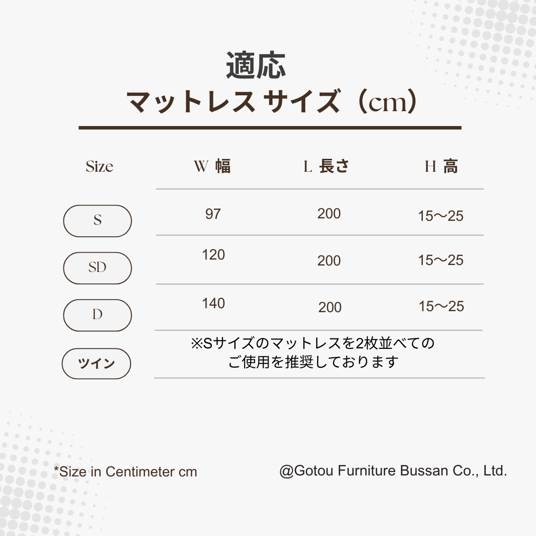 サイズ | 運送会社:大型家具配送便 リードタイム:7~10日 【製品SIZE】 ■Sサイズ W99×L205.7×H85 SH258/208/158 ㎝ ■SDサイズ W121×L205.7×H85 SH258/208/158 ㎝ ■Dサイズ W141×L205.7×H85 SH258/208/158 ㎝ ■ツインサイズ W198×L205.7×H85 SH258/208/158 ㎝ (※ツインサイズ 上記寸法は、右側・左側の2台を並べた際の合計サイズです。) 【適用マットレスSIZE】 ■Sサイズ W97×L200×H15~25 ■SDサイズ W120×L200×H15~25 ■Dサイズ W140×L200×H15~25 ■ツインサイズ Sサイズ(シングル)マットレスを2枚並べて構成される寸法です。 |