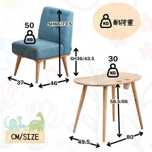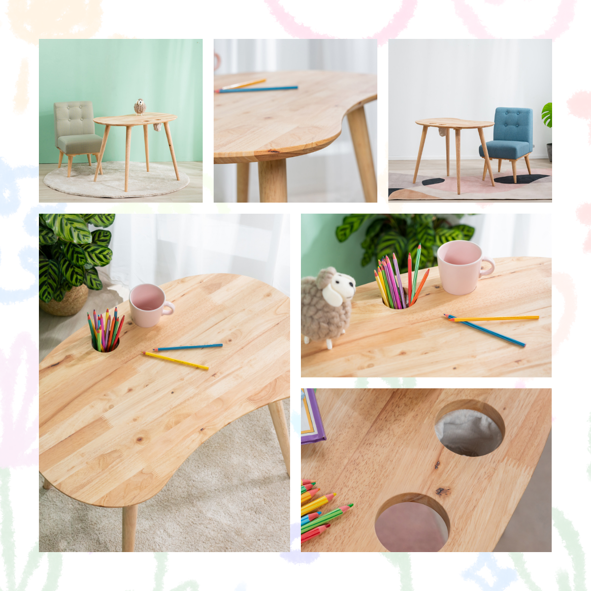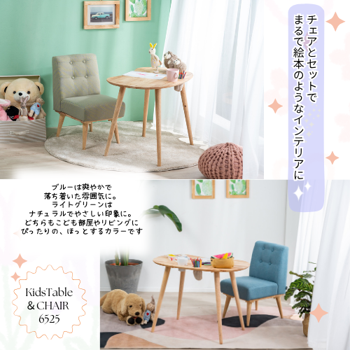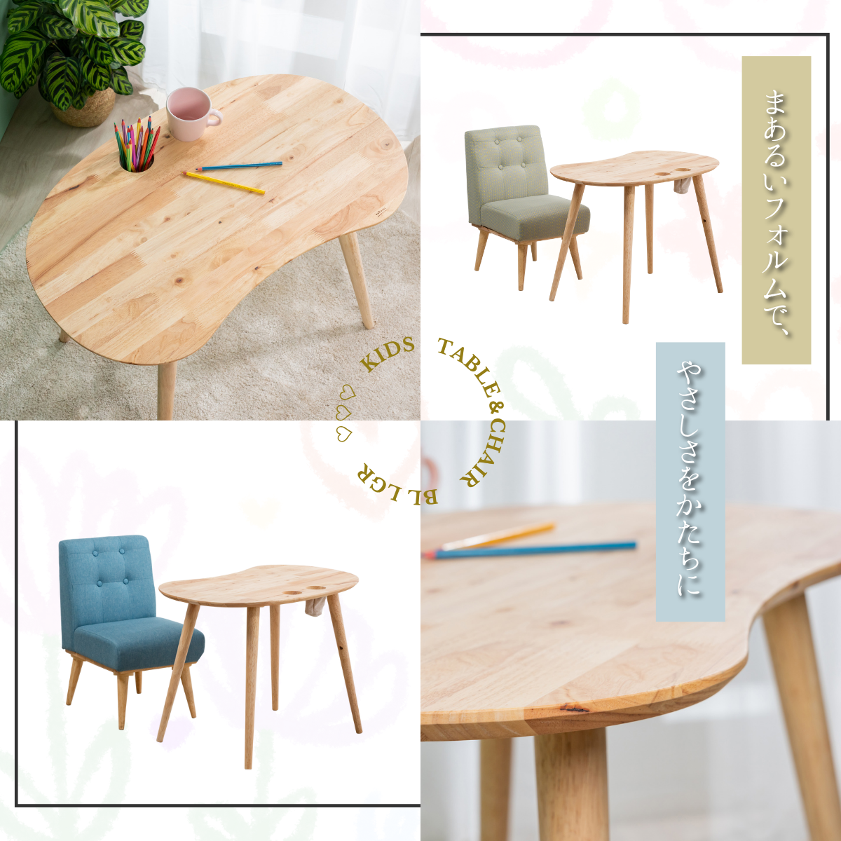 チェアとセットでかわいくまとまるデザイン。爽やかなブルー、やさしいライトグリーン、どちらもお部屋になじむ癒しカラー。F★★★★基準クリアの安心素材で、こどもにも空気にもやさしい設計。まあるいフォルムと面取り加工で、安全性もばっちりです。
