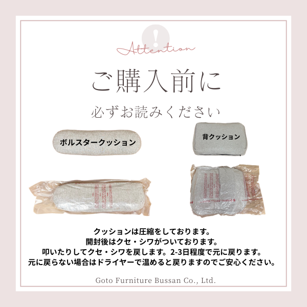 背もたれクッションは圧縮梱包のため、クセやシワが出る場合がありますが、数日で自然に戻ります。(個体差あり)