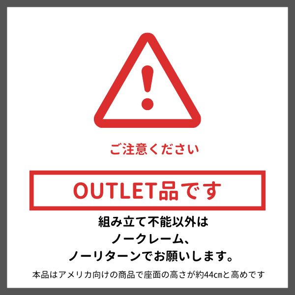 | 注意事項 | - 本商品は アウトレット特価品 につき、多少の個体差や細かな仕上げに差がある場合があります。 - 背もたれクッションは圧縮梱包のため、開封直後はクセやシワが付いている場合があります。数日で自然に戻りますのでご安心ください。 - 組立は工具不要の差し込み式ですが、脚部のみ六角レンチでの取り付けが必要です。 - アウトレット商品のため、-組み立て不能以外は ノークレーム・ノーリターン でお願いいたします。 - 表示サイズ・重量は目安です。多少の誤差が生じる場合があります。 |