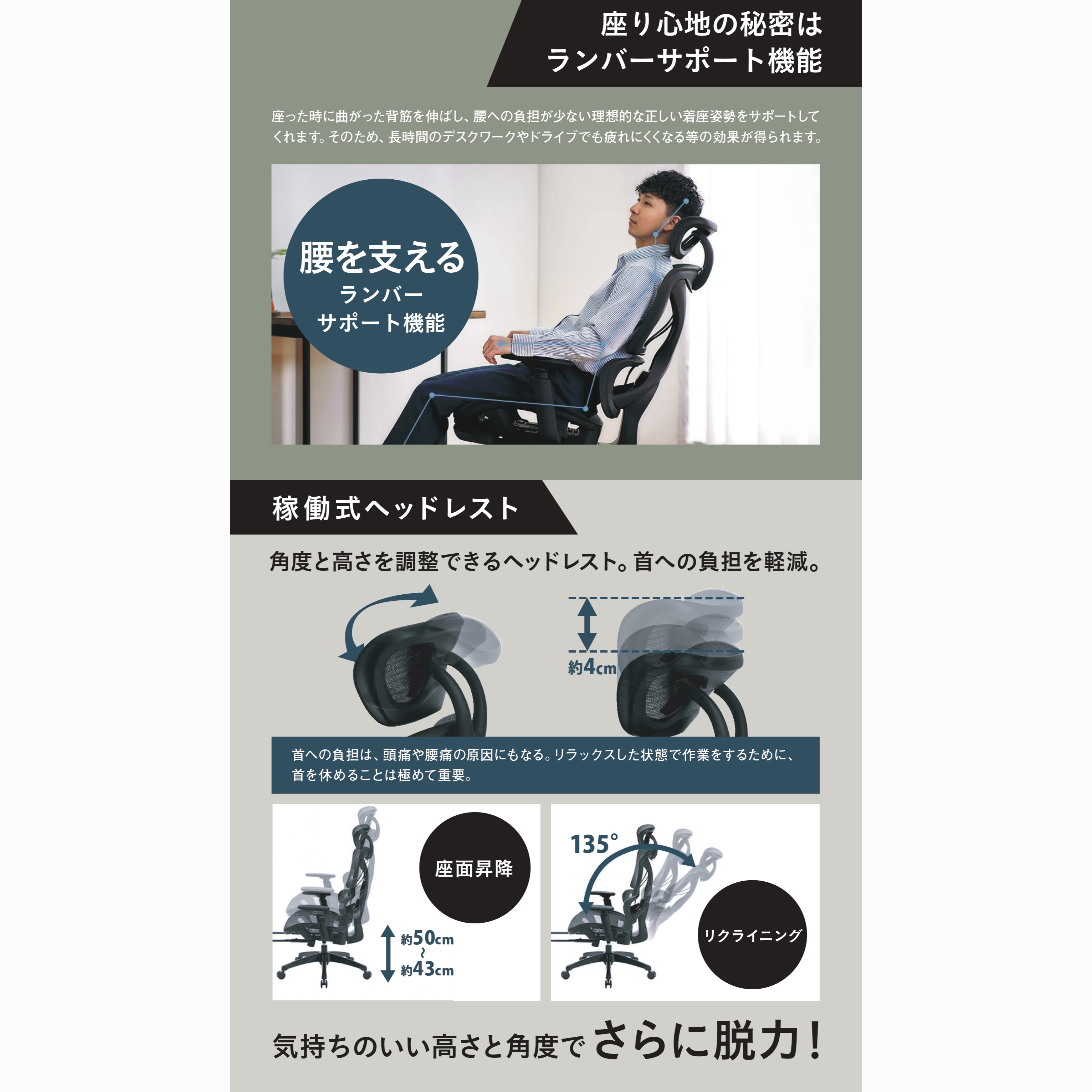 「長時間でも疲れ知らず。からだファクトリー監修の安心設計」