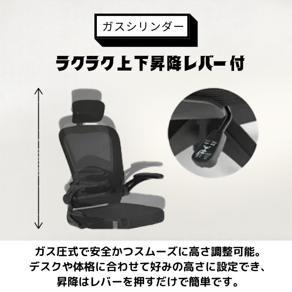 ・高さはガス圧昇降式でデスクや体格に合わせて調整可能。