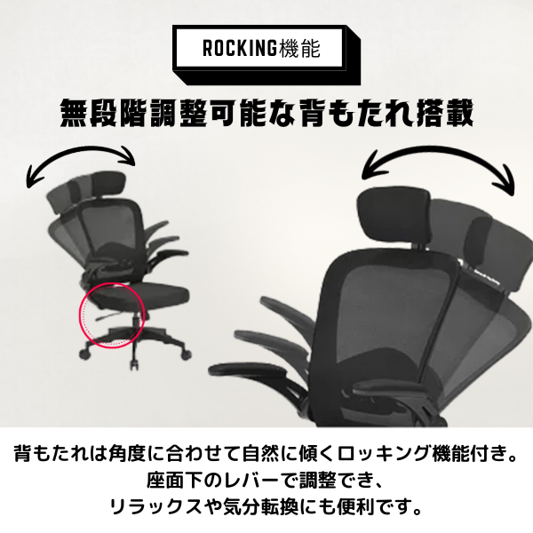 ・背もたれは角度に応じて自然に傾くロッキング機能を搭載。