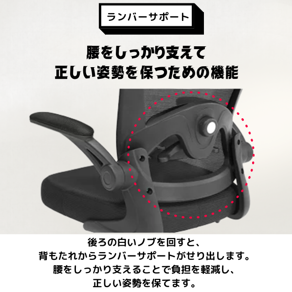 さらにランバーサポートが腰をしっかり支え、負担を軽減しながら正しい姿勢を保てます。