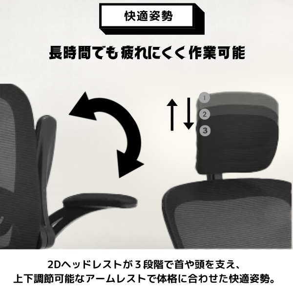 ヘッドレストは3段階、アームレストは上下調節ができるため、より快適な姿勢で作業を続けられます。
