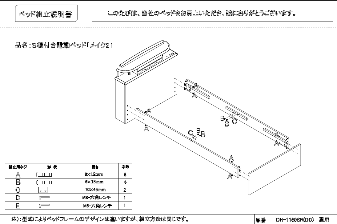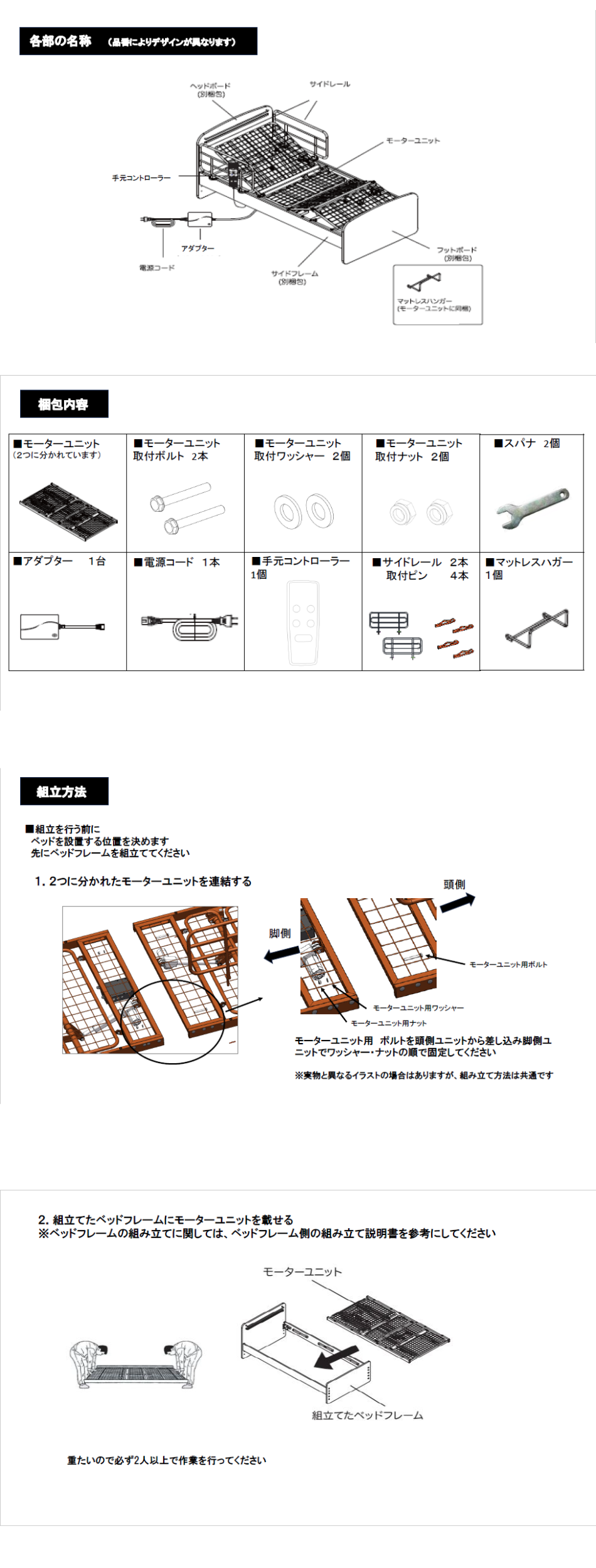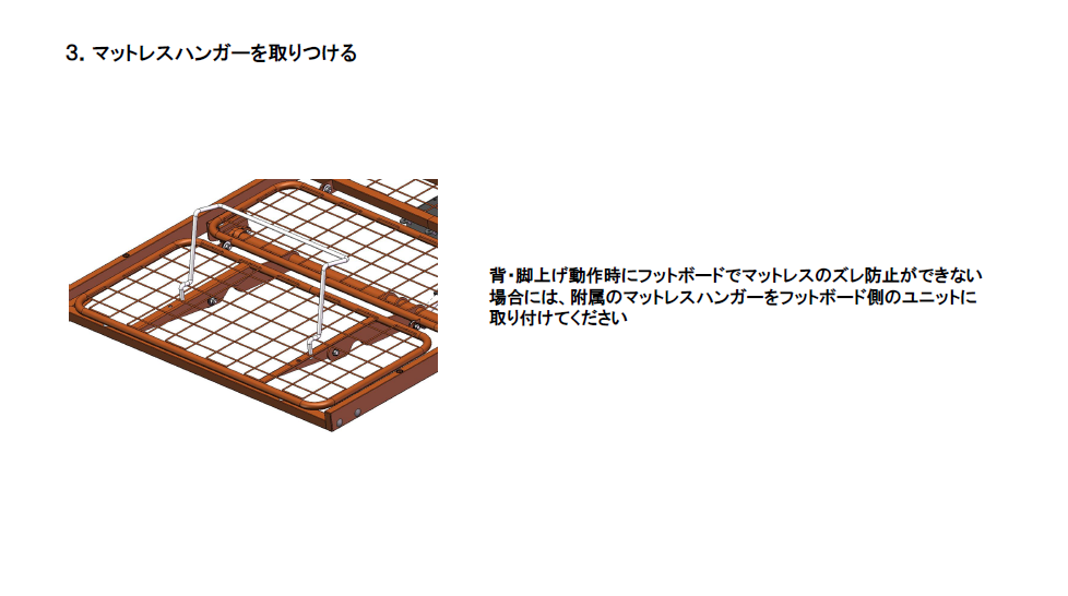 | 注意事項 | • ご使用前に必ず取扱説明書をお読みください。 • ベッドの高さ調整やギャッジ機能を操作する際は、利用者の安全を確認してください。 • サイドレールは確実に固定してください。取り付けが不十分な場合、転落防止効果が得られません。 • 電源コンセントの使用は定格容量を守り、たこ足配線は避けてください。 • ベッドの上で飛び跳ねたり、過度な荷重をかけたりしないでください。 • 定期的にボルトやネジの緩みを点検し、必要に応じて締め直してください。 • 本製品は医療機器ではありません。介護や一般的なリラックス用途を目的としています。 【メーカー商品の為、ご注文後のキャンセルはできかねます。予めご注意ください。】 |