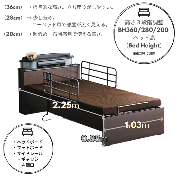 高さ調整機能: 組み立て時に床高を3段階(360mm・280mm・200mm)に調整可能。利用者の体格や介護環境に合わせて柔軟に対応します。