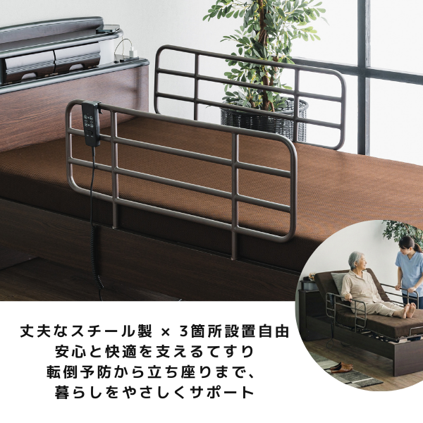 介護の現場から日常まで。人に寄り添うベッド。 てすりはスチール製で耐久性抜群。長期使用でも安心の堅牢設計です。