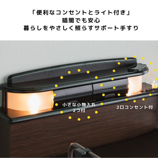 便利な機能: ヘッドボードには2口コンセント&ライト付き。枕元でのスマホ充電や読書に便利です。