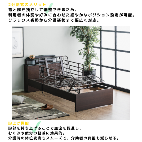 快適な操作性: 2分割式ギャッジ機能(2モーター)で背上げ・脚上げがスムーズ。介護やリラックス用途に最適です。