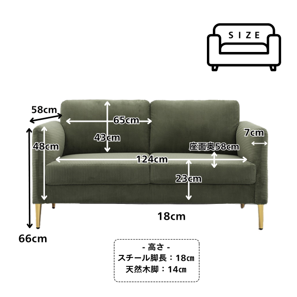 | サイズ | 【内寸(座面サイズ)】 ・背もたれ高さ:43cm ・座面奥行:58cm ・座面幅:124cm ・肘掛け高さ:66cm ・座面高:スチールゴールド脚の場合:41cm 天然木脚の場合:37cm 【脚の高さ(選択式)】 ・スチールゴールド脚:18cm(一般的なソファ脚より高めで、空間をすっきり見せます) ・天然木脚:14cm(ほどよい高さで、圧迫感を抑えたデザイン) 【梱包サイズ】 137×66×42cm(3辺合計245cm) 個口数:1 【配送】 佐川急便 |