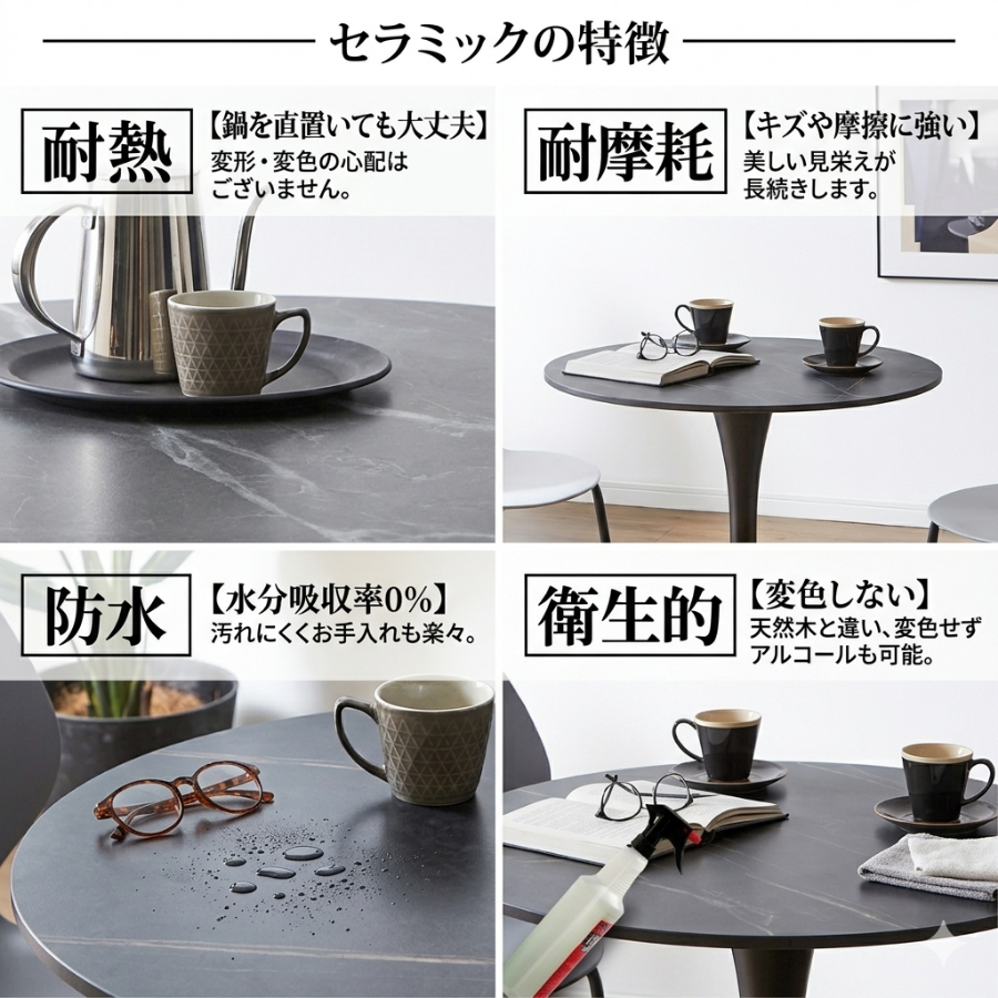 カフェテーブルは強くて美しいセラミック天板。